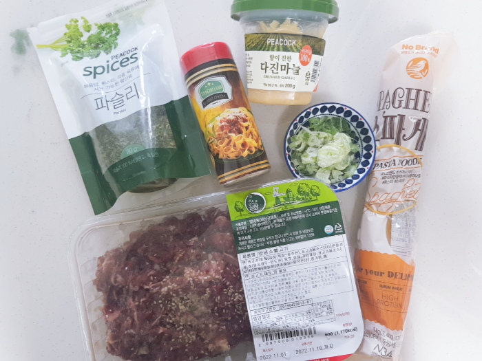 양념소불고기(600g), 스파게티면(2인분, 500원 동전크기 X 2), 다진마늘, 다진파, 파마산 치즈가루, 파슬리 가루, 간장, 소금