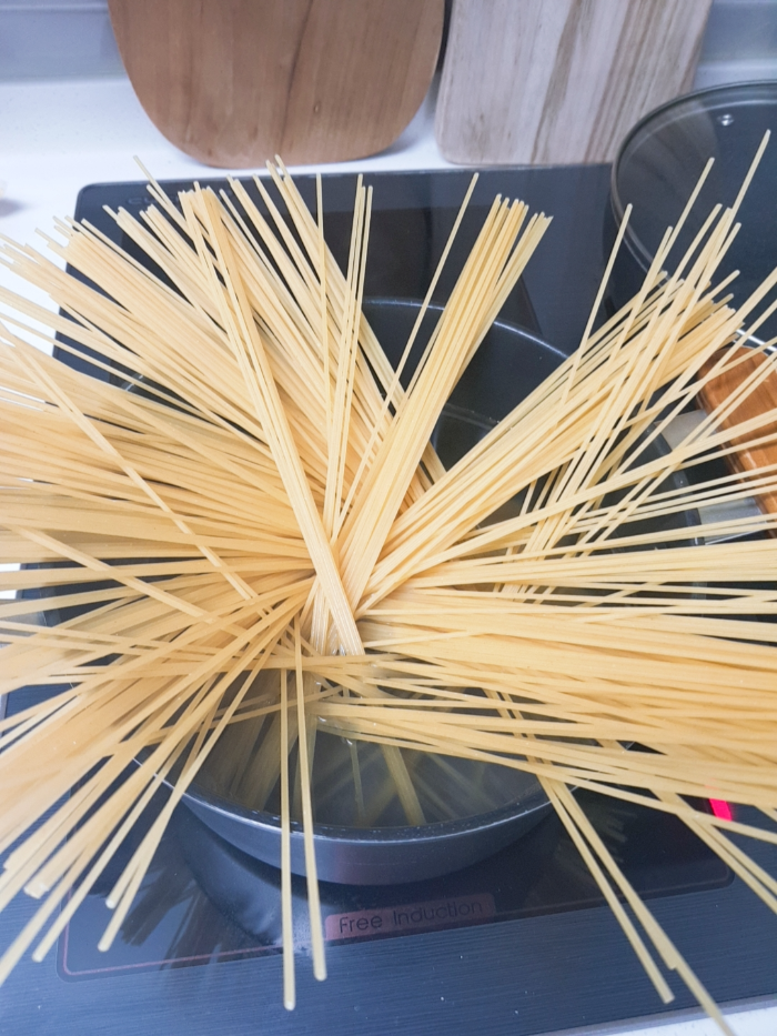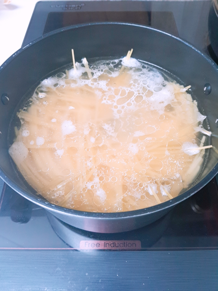 1. 끓는 물에 소금과 기름(올리브유가 없었다...)을 조금 넣고 스파게티 면을 넣어준다.