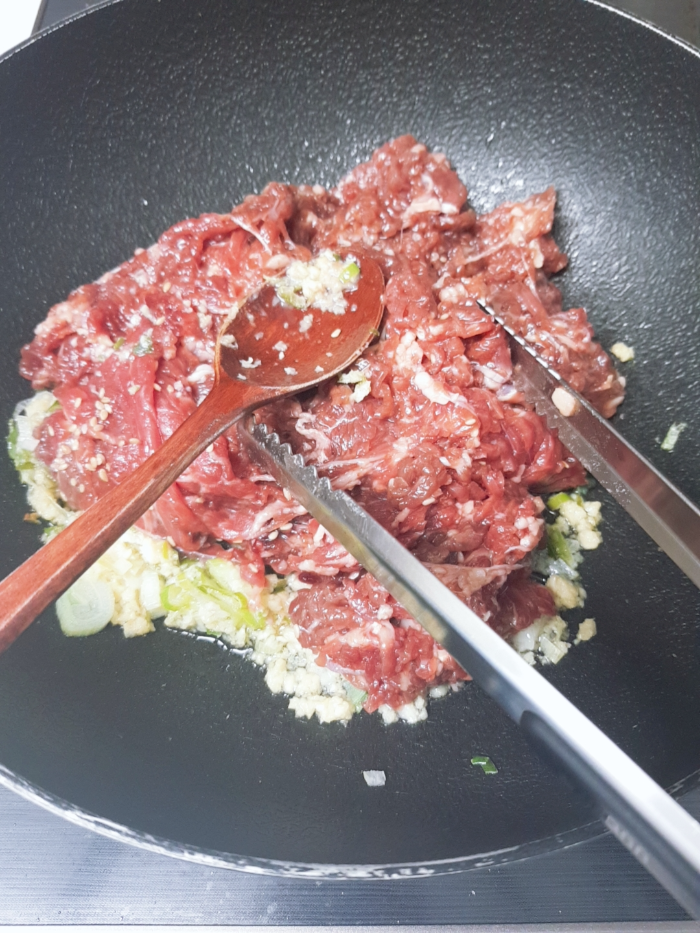 3. 불고기를 같이 넣고 볶아준다. 이 때부터 스물스물 올라오는 양많아 스멜...