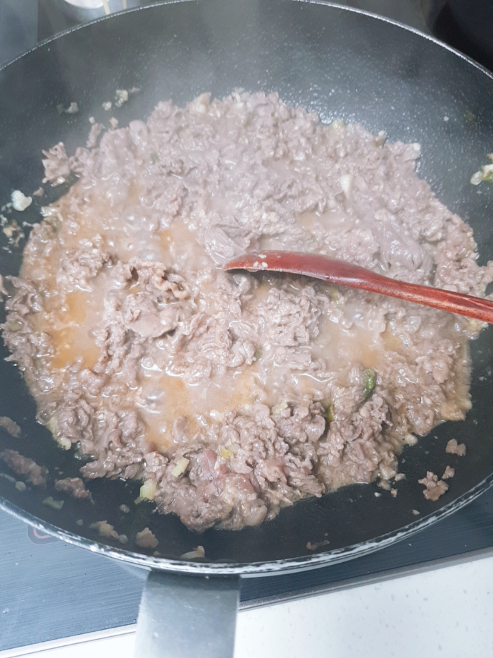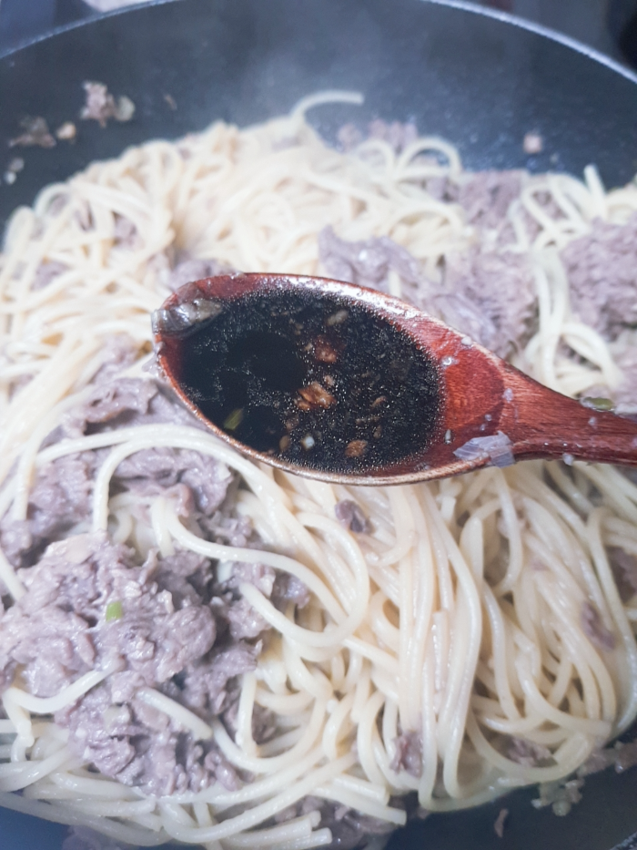 5. 간을 봤는데 면이랑 고기랑 너무 따로 놀아서 간장 2숟갈을 추가해 섞어줬다.
