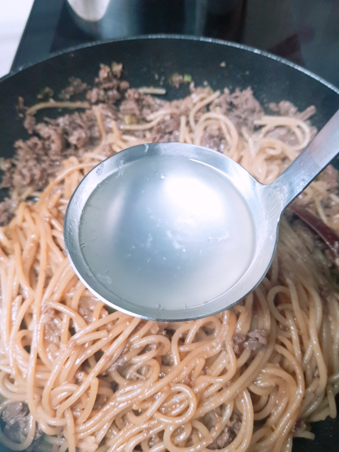 6. 너무 국물이 없는 것 같아서 촉촉해 보이라고 면수 한 국자를 넣어줬다.