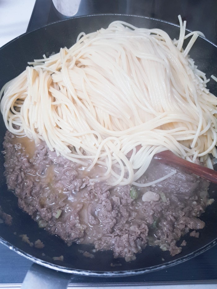 4. 고기가 갈색으로 다 익어갈 때 쯤 다 익은 스파게티면(살짝 덜익혀도 되는데 너무 많이 익혔네..)을 넣고 같이 섞어준다.