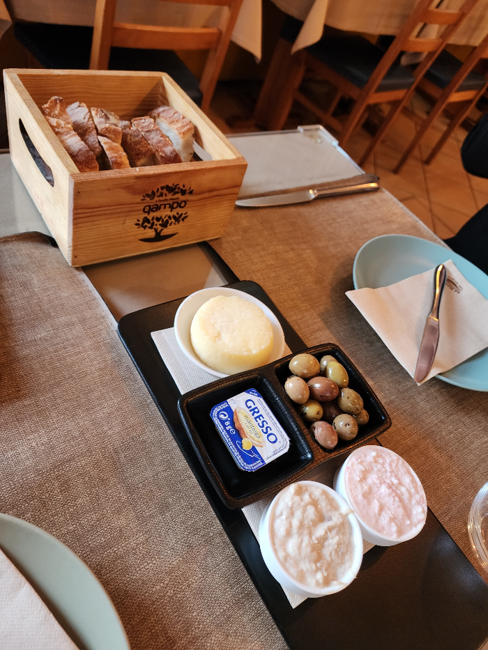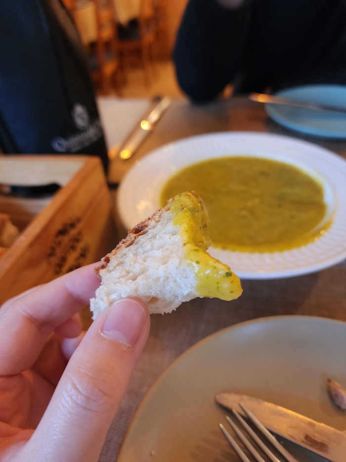 기분 좋게 스타터로 요기를 해주는데 빵이 참 쫄깃쫄깃하고 맛있었고 크래미를 갈아 넣은 것 같은 독특한 소스 2가지가 입맛을 돋게했다. 사실 이런 스타터 음식 문화 익숙치 않아서 어떻게 먹는 건지도 잘 모르겠으나 그냥 있는대로 버터도 발라보고 치즈도 썰어서 얹어보고 내 맘대로 내 식대로 골라 먹는데 나름 또 재미있는 듯.